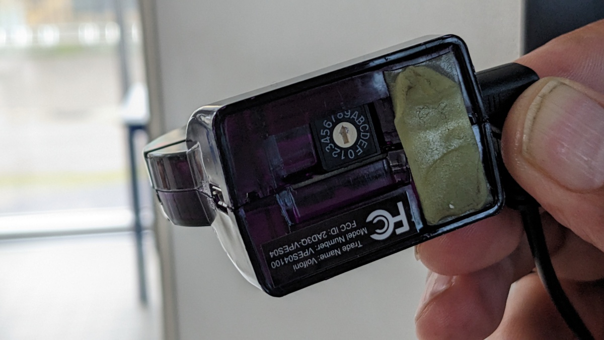 Positionner le canal de Radio Fréquence (RF) via la flêche à l'aide d'un petit tournevis sur position 8 comme indiqué sur la photo ci-desosus, comme suggéré par la documentation de Volfoni sur leur trouble shooting