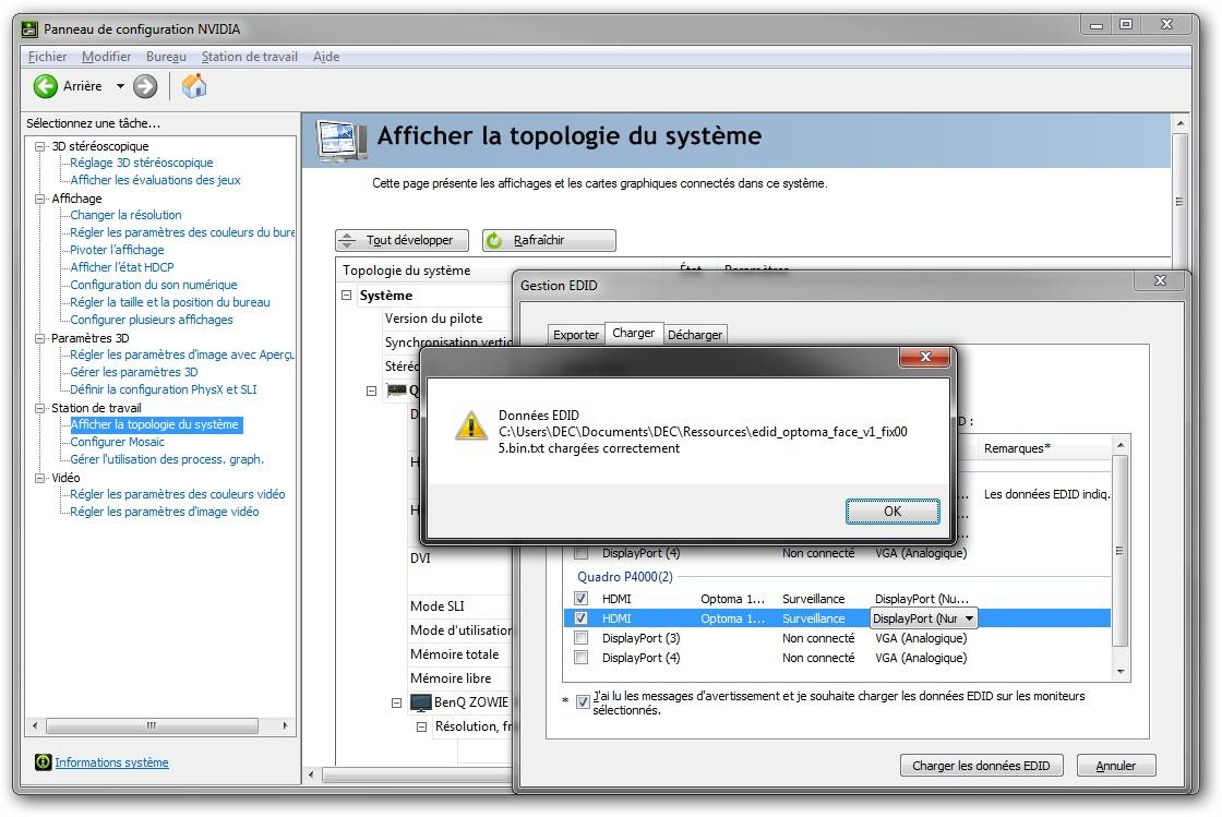 Cette configuration ne permet pas en l'état de créer une mosaïque car le système va le refuser pour des raisons de sécurité. Virtuelconcept a donc créé un EDID spécifique Optoma DEC Fx qui répond aux caractéristiques demandées :