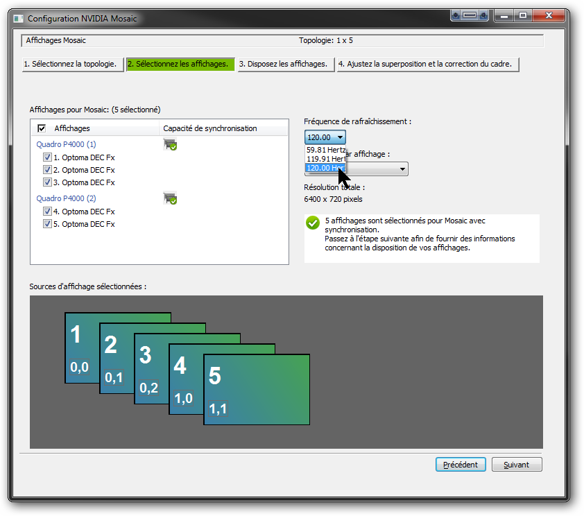 Sélectionner la fréquence de rafraîchissement 120Hz et la résolution 1280 x 720 par affichage pour une résolution totale de 6400 x 720 (7680 x 720 pour la version avec casquette)