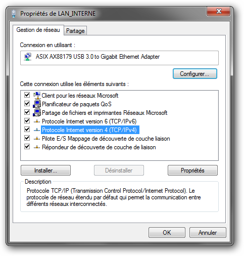Sélectionner la configuration du controller AX88179 et éditer les valeurs du protocole Internet version 4 (TCP/IPv4).
