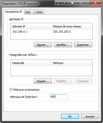 paramètres avancéset saisir 900 comme valeur de métrique de l'interface.Valider les modifications en cliquant sur "