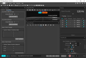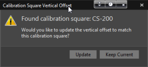 Pendant le process de calibration, un carré de calibration est utilisé pour définir les axes de coordonnés globaux ainsi que la surface du sol. Motive reconnait directement le carré de calibration utilisé (ici CS-200) avec sa valeur offset vertical et de taille de market (cf. valeurs affichées). Le message suivant peut apparaître en vous demandant si vous souhaitez changer les données du carré de calibration. A priori en utilisant l'équerre fournie, la valeur est la bonne et que l'on clique sur "update" ou "keep current" devrait avoir le même effet. Pour plus d'information, cf. documentation de Motive