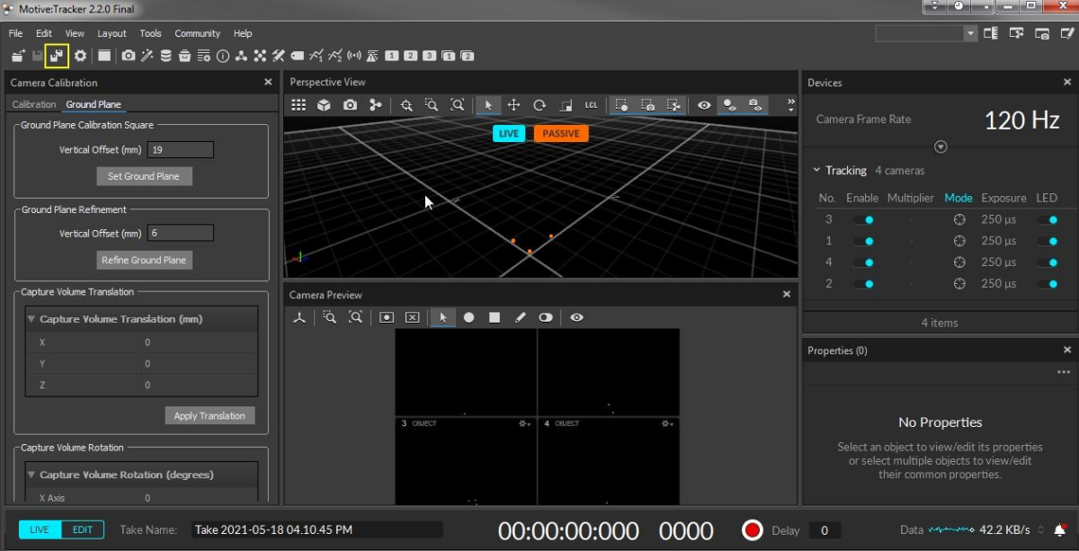 L'opération s'effectuant en suivi de l'opération de calibration des caméras opérée dans le logiciel Motive, l'onglet Ground Plane devrait s'afficher automatiquement à la fin de la première étape de calibration. Sinon click sur le bouton "