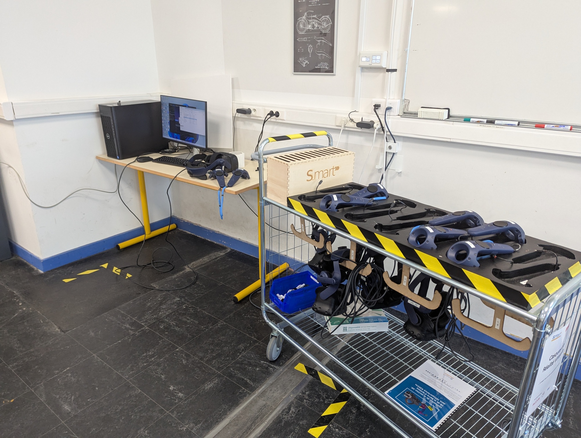 Financée par le projet DemoES INCLUDE (en partenariat avec Université Lyon 1), une salle de réalité virtuelle a été intallée sur le campus de Lyon dans au premier étage du bâtiment Joseph Jacquard, dans la salle d'innovation du pôle S.MART. La salle est équipée de 7 casques de réalité virtuelle HTC VIVE PRO 2 reliés à un ordinateur et équipés de manettes de contrôle, qui permettent aux utilisateurs d'interagir avec l'environnement virtuel.