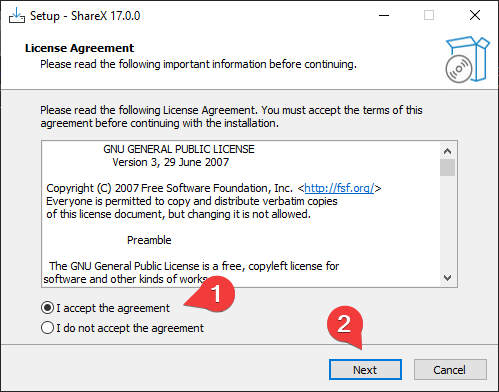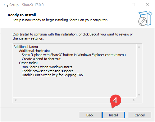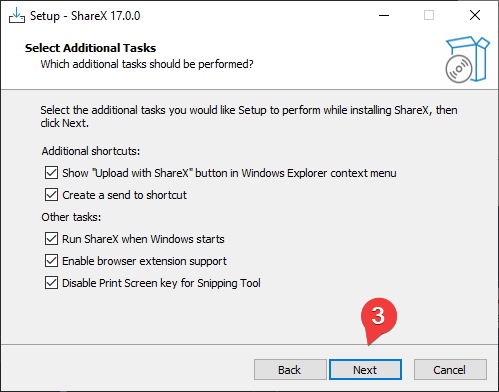 Installation de ShareXProcédure : Installation de ShareX⚓ProcédureTéléchargement de l'application sur le site Internet⚓ShareX peut être installé en suivant ce lien : ShareX - The best free and open source screenshot tool for Windows.Procédure d'installation⚓Bien faire attention à accepter les conditions d'utilisation, puis appuyer sur Next.Ne rien changer à cette étape et appuyer sur Next.L'installation devrait s'effectuer après cette étape. Continuer avec Next.Si l'installation s'est faite correctement, le message suivant devrait s'afficher. Vous pouvez fermer l'installateur.