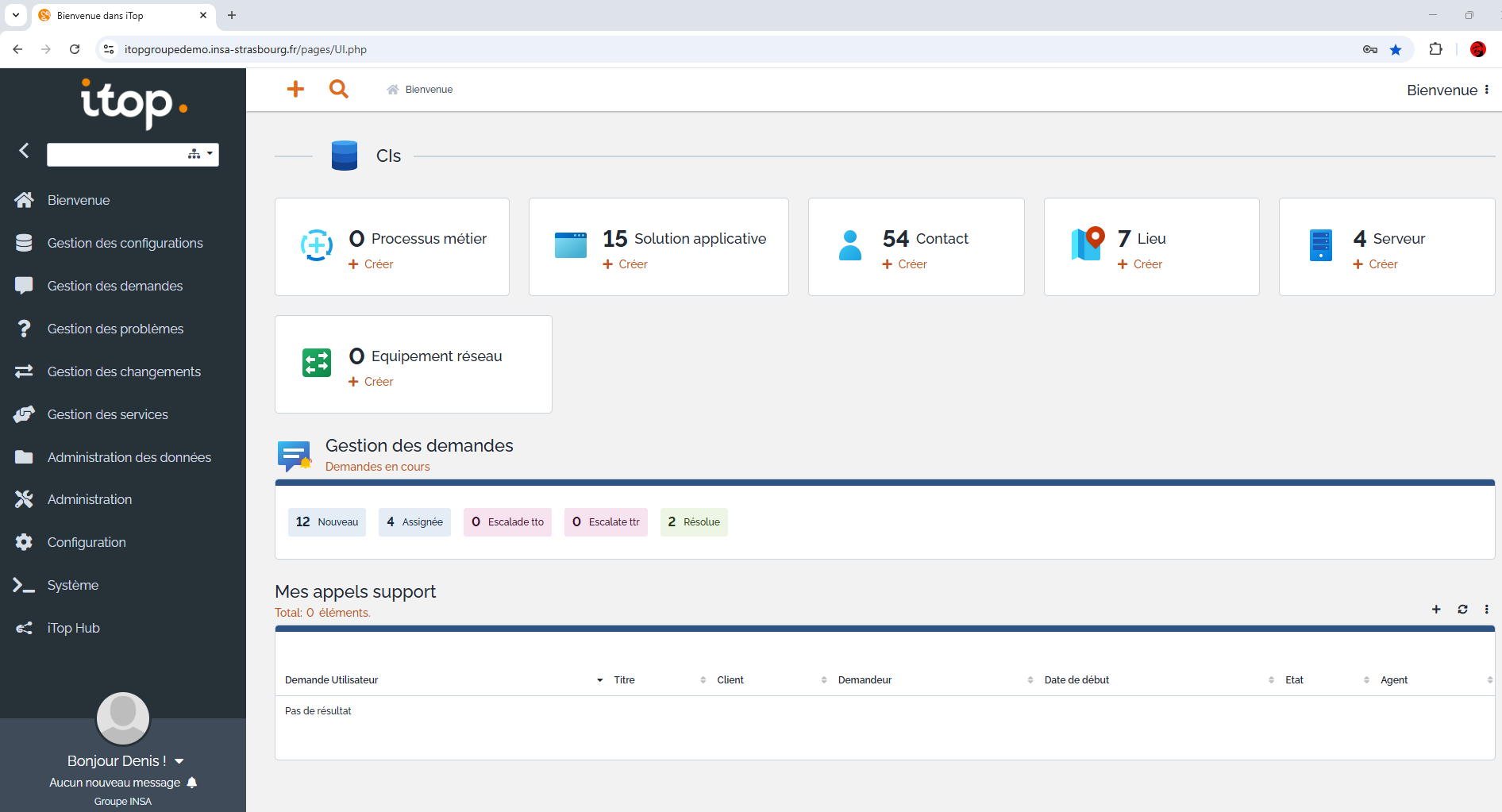L'objectif est de fournir un espace centralisé pour le recensement et la gestion du support de l'ensemble des services numériques fournis par le Groupe INSA.