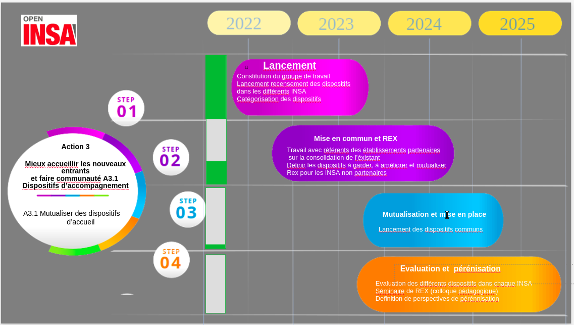 L’accueil des primo-entrants est un levier essentiel de la réussite étudiante au sein des établissements INSA, notamment dans un contexte de diversification croissante des profils. Les nouveaux étudiants ont des besoins forts en méthodologie, repères institutionnels et accompagnement personnalisé. Avant le lancement de cette action, plusieurs dispositifs existaient déjà et étaient mutualisés via Open-Moodle, mais de nombreuses initiatives restaient dispersées dans les différents INSA. Le projet a donc d’abord consisté à recenser et analyser l’ensemble de ces pratiques pour en identifier les forces et les complémentarités : l’objectif final était de proposer un socle partagé d’accompagnement à la transition lycée-INSA, adapté à tous les établissements du Groupe.