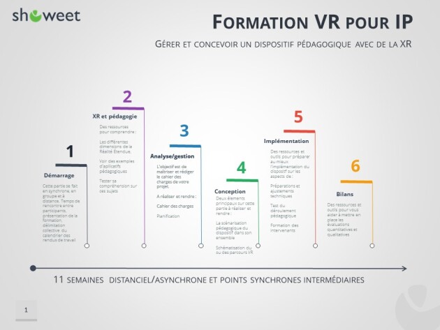 Deux modules de formations : Sensibilisation à la VR (tous publics) et Conception et gestion de projets VR à destination des ingénieur(e)s pédagogiques et des enseignants volontaires.