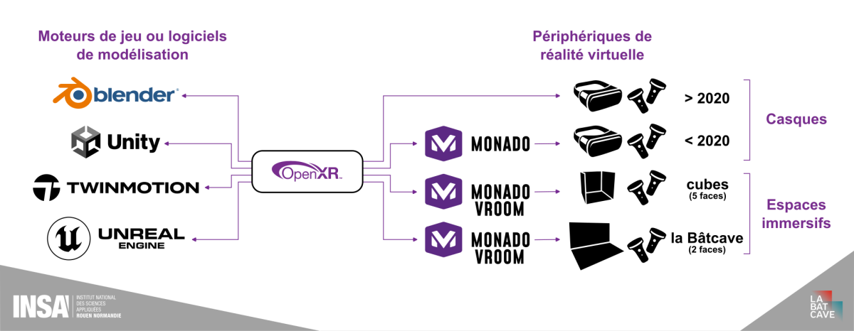 Durant le projet, les travaux de recherche, menés notamment par l'INSA Rouen Normandie et le projet Bâtcave, ont permis de grandes avancées pour mettre en adéquation le Cube immersif avec la norme Open XR, notamment à travers des développements sur le plugin Monado, qui gère la projection et interactions.