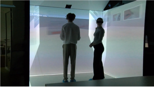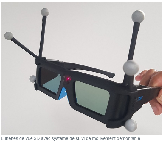 Une des personnes dans le cube sert de "guide" dans l 'environnement immersif car elle est équipée d'une paire de lunettes munie d'un système de suivi de mouvement démontable pour lunettes 3D, reliée à émetteur radio fréquence active pour lunettes 3D.
